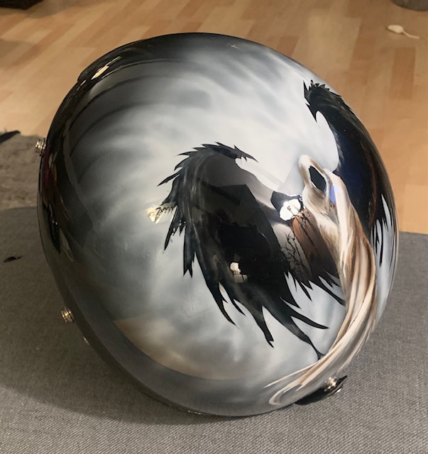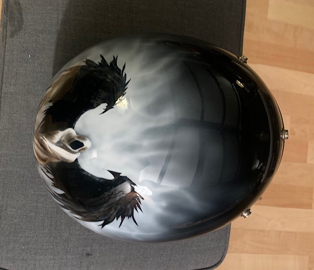 Um die Qualität und Haltbarkeit der Designs zu gewährleisten, setze ich auf eine professionelle Klarlackversiegelung. Dies schützt die kunstvollen Motive nicht nur vor Witterungseinflüssen, sondern sorgt auch dafür, dass der Helm über Jahre hinweg strahlend schön bleibt.