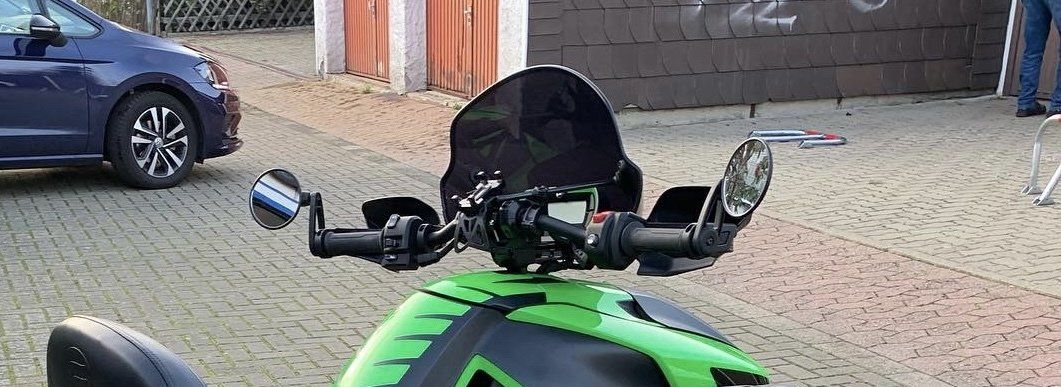 Zunächst müssen die Spiegel ab. Dafür die Schrauben an der Außenseite des Lenkers lösen und ca. 1 cm herausdrehen. Anschließend vorsichtig mit einem Hammer auf den Schraubendreher schlagen und die Schraube in den Lenker treiben. In der Spiegelhalterung ist ein Keilsystem, das durch das Anziehen der Schraube auseinandergedrückt wird. Durch das hineinschlagen löst sich dieses Keilsystem und die Lenkerhalterung des Spiegels kann aus dem Lenker gezogen werden.